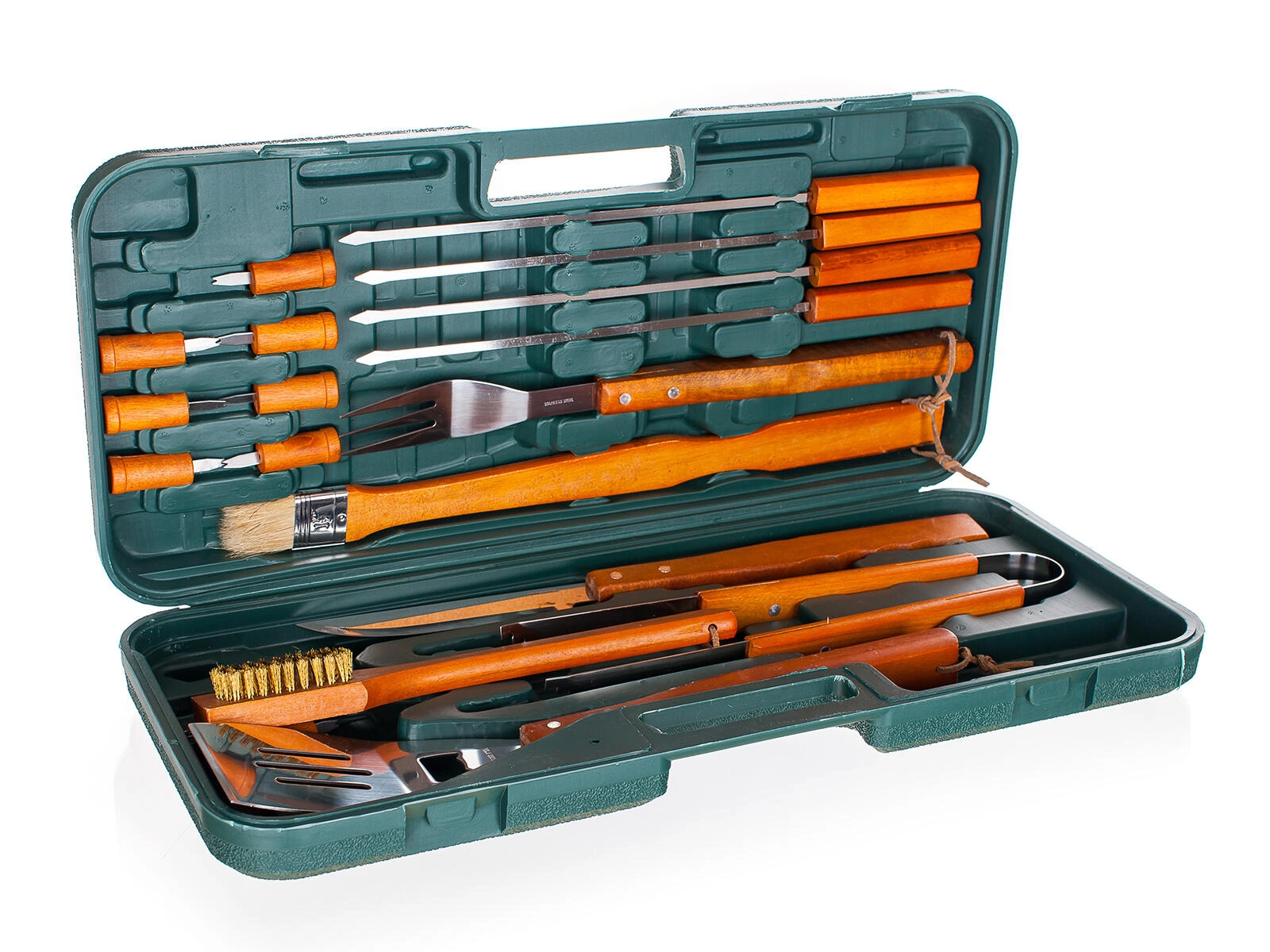 Celovit komplet za ljubitelje žara v praktičnem kovčku vsebuje vse potrebno za pripravo popolno pečenih jedi. Nerjavno orodje z udobnimi lesenimi ročaji je odporno, varno in enostavno za vzdrževanje. Zahvaljujoč dolgim orodjem, zankam za obešanje in pregledni razporeditvi v kovčku je peka na žaru udobna in organizirana. 18-delni komplet, nerjavna jekla, leseni ročaji, praktičen plastičen kovček.