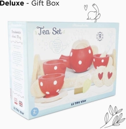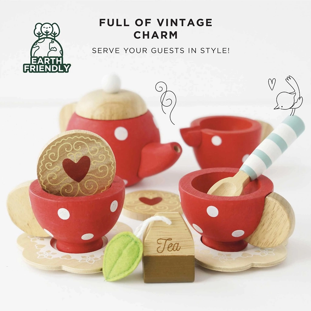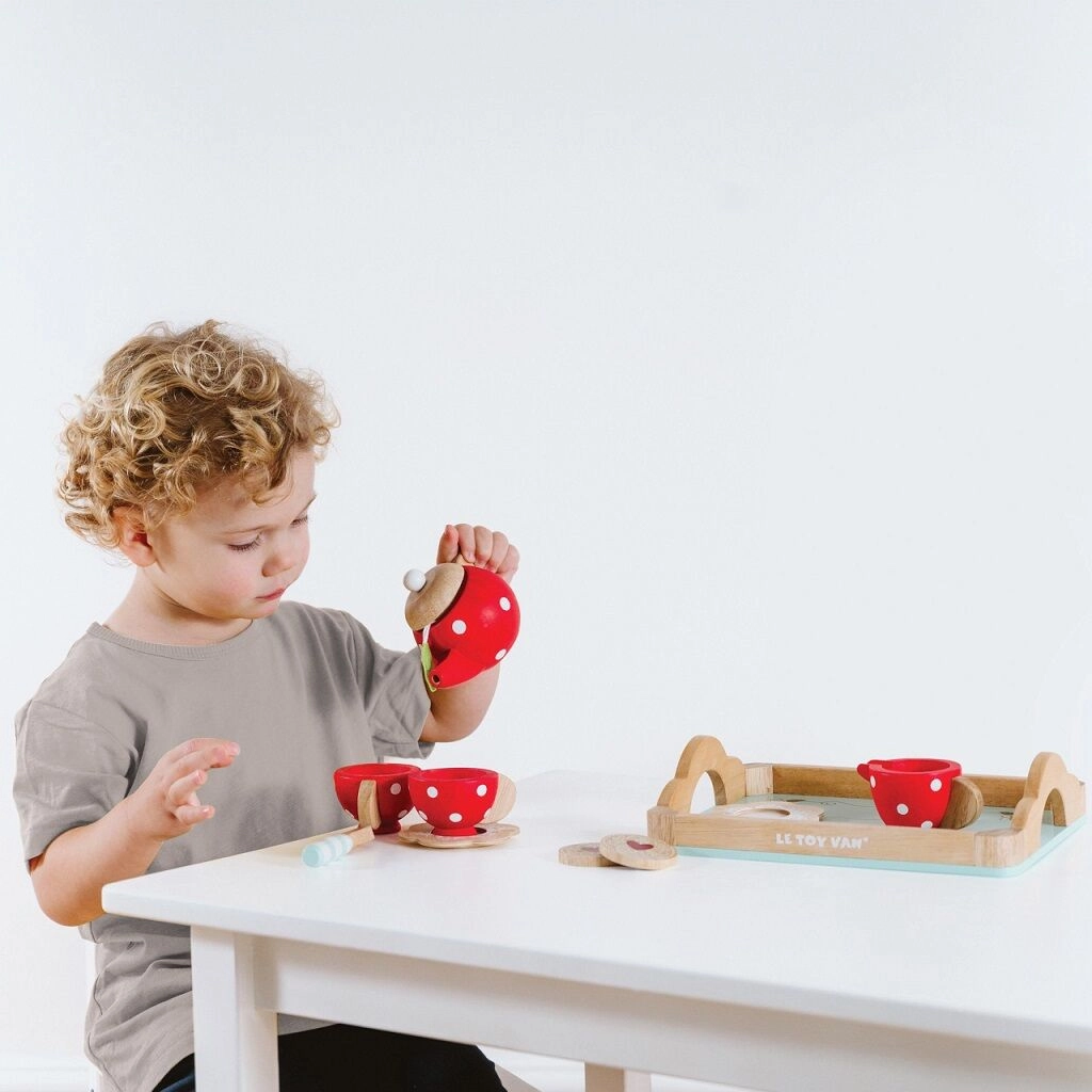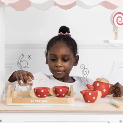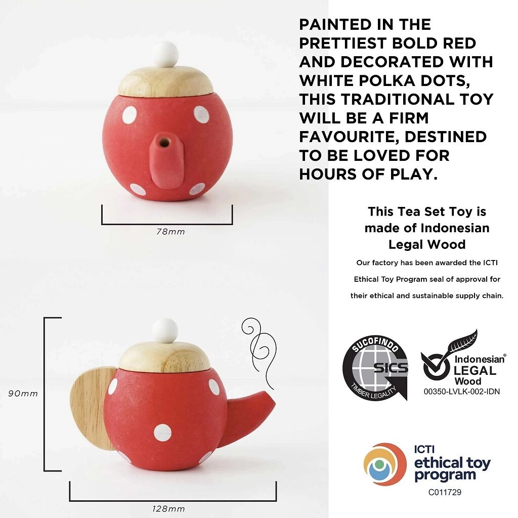 Stilski leseni čajni set za male gostitelje prinaša ure pretvarjalne igre in razvijanja fine motorike. Rdeče skodelice in čajnik z belimi pikami, postreženi na čvrstem pladnju, vabijo k skupnemu čajnemu druženju. Izdelano iz trajnostnega lesa, pobarvano z netoksičnimi barvami na vodni osnovi in zasnovano z mislijo na varnost in kakovost.