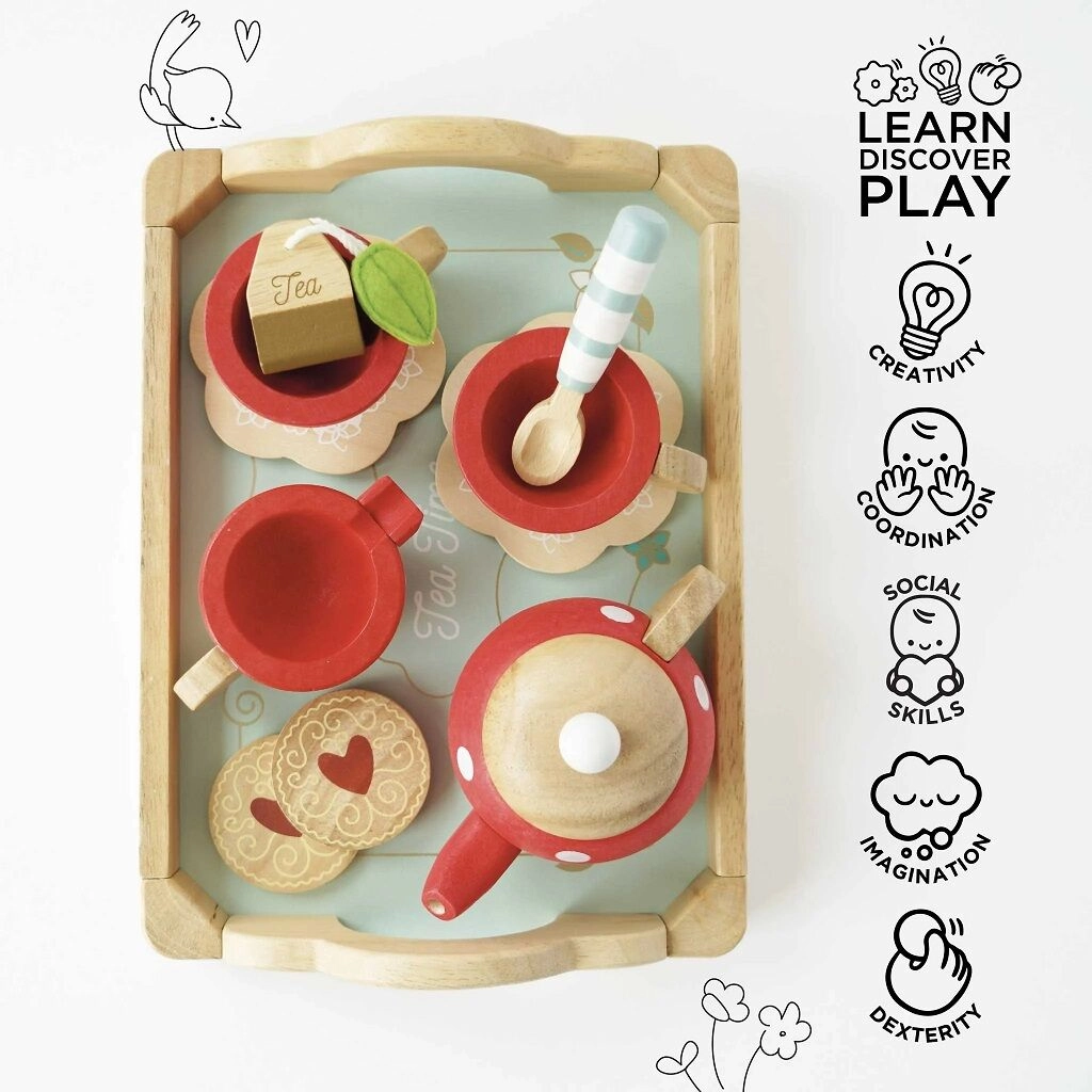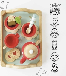 Ta leseni čajni set je etično izdelan iz trajnostnih materialov in ročno dodelan z okoljskimi barvami. Otroci med igro razvijajo domišljijo, socialne in verbalne veščine ter kognitivne funkcije – na zabaven in varen način.