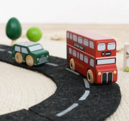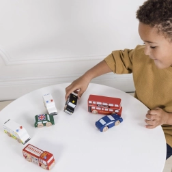 Odkrijte svet živahnih londonskih ulic s podrobno izdelanimi lesenimi vozili Le Toy Van. Komplet vključuje dvonadstropni avtobus, črni taksi, gasilski avto, reševalno vozilo, policijski avto in dva osebna avtomobila. Robustna izvedba iz trajnostnega kavčukovega lesa ter gladki robovi so idealni za male otroške roke, ki pri igri urijo prijem, koordinacijo roka–oko in domišljijo.