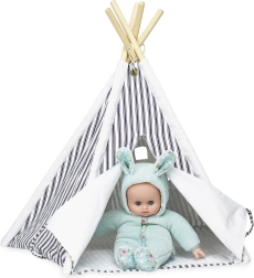 Stilski mini tipi znamke VILAC je idealen dodatek za otroške igre s punčkami. Ponuja trdno leseno konstrukcijo, preprosto sestavljanje in tekstilen pregrinjalo v modernem črtastem dizajnu v temno sivi in beli. Odlično se poda v otroško sobo kot prijeten kotiček za punčke in dekorativni element.