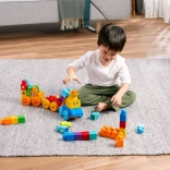Barvne kocke s črkami spodbujajo prepoznavanje oblik črk in prvo sestavljanje besed. Otroci naravno razvijajo besedni zaklad in logično razmišljanje.