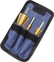 Univerzalni komplet stopničastih svedrov iz vzdržljivega jekla s titanovo prevleko za čiste in natančne luknje v pločevini, PVC in kovini brez predvrtanja. Jasno berljiva skala na vsakem svedru olajša izbiro premera, šesterokotni vpenjalni del 6 mm zagotavlja zanesljivo vpetje, praktično etui pa svedre ščiti pri prenašanju.