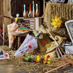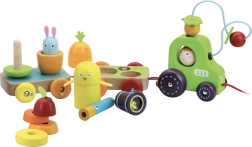 - Drseče kroglice: Traktor ima kroglice na žici v obliki sadja, ki spodbujajo motorične sposobnosti.