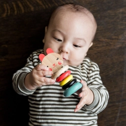 Privoščite svojemu dojenčku varno in čutno spodbudno igračo. Lesena ropotulja zajček ob nežnem stresanju oddaja prijeten trkajoč zvok, ki pomirja in podpira zaznavanje zvoka. Zaradi kompaktnih mer se ropotulja odlično drži in razvija fino motoriko ter koordinacijo roke in očesa.