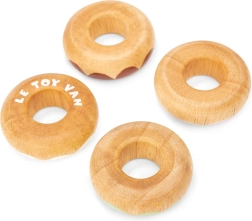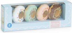 Ta komplet lesenih krofov Le Toy Van je ne le estetsko prijeten, temveč predvsem varen in izdelan iz masivnega lesa. Vsak krof je nežno zaobljen za varno igro in okrašen s pastelnimi odtenki z različnimi vzorci posipov. Vodne barve, uporabljene pri ročnem dodelovanju, so netoksične in popolnoma varne za otroke.