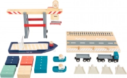 Ta premišljeni pristaniški gradbeni set otrokom prinaša realistično logistično igro: ladja z dvema vlačilcema je pripravljena na izplutje, medtem ko žerjav pretovarja barvite zabojnike z integriranimi magneti. Robustni leseni deli in gladko delujoči elementi podpirajo fino motoriko, domišljijo in potrpežljivost.