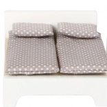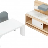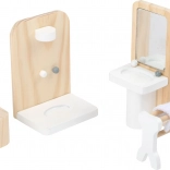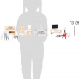 Stilska in brezčasna garnitura pohištva SMALL FOOT vsakšno hiško za punčke spremeni v prijeten dom. Kombinacija naravnega lesa in bele barve deluje čisto in moderno, detajli, kot so blazinice, lučke in ogledalo, pa igri dodajo pristnost. Deli so prilagojeni majhnim otroškim rokam ter se odlikujejo po trdnosti in vzdržljivosti.