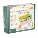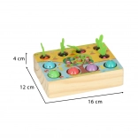 Otrok naj se odpravi k ribniku in na vrt – brez odhoda od doma. Igralna osnova iz masivnega lesa skriva odprtine za ribice, črvičke in barvne korenčke. Otroci jih lovijo z magnetno palico ali jih izvlečejo za filcaste listke, s čimer naravno vadijo prijem in občutek v prstih.