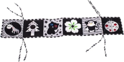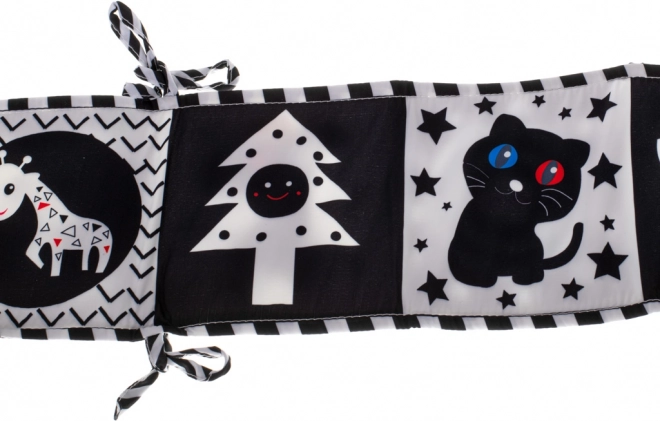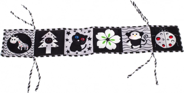 Kontrastna senzomotorična knjigica, zasnovana kot zaščita za posteljico, je popolna izbira za otroke, ki začenjajo odkrivati svet. Knjiga v obliki harmonike je lahko enostavno pritrjena na posteljico s pomočjo vrvic, kar prinaša ne le zabavo, ampak tudi varnost.