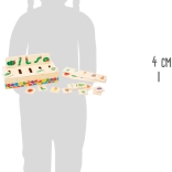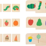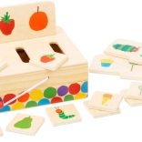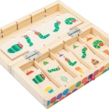 Dizajn s priljubljenim motivom Very Hungry Caterpillar otroke takoj pritegne. Ploščice in pokrov so enostavni za uporabo, trpežna lesena izdelava pa zagotavlja dolgo življenjsko dobo. Po igri vse preprosto zaprete z elastičnim trakom – nič se ne raztrese.
