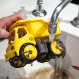 Igrača posnema velike gradbene stroje, njen izrazit rumen videz pa pritegne pozornost vsakega malega graditelja.