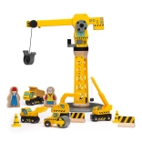 Ta kakovosten leseni gradbeni set z vrtljivim žerjavom in magnetnim kavljem prinaša otrokom neskončne možnosti igre. Zaradi robustne izdelave in varnih materialov je idealen za vsakodnevno igranje in razvoj veščin. Živahna rumena barva gradbenih vozil otroke takoj pritegne.