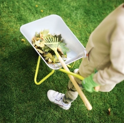 Komplet vključuje lopato, grablje in bombažne rokavice, kar ga naredi idealnega za majhne vrtne pomočnike.