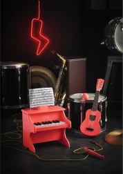 Ohišje kitare je izdelano iz kakovostnega lesa in premazano z obstojnim, sijočim lakom v oranžni barvi. Idealno za vsakodnevno igranje in otroško raziskovanje zvokov.