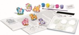 V tem ustvarjalnem setu lahko oblikujete in barvate mavčne odlitke. Izdelek vsebuje vse potrebno za izdelavo magnetkov ali brošk v obliki samorogov.