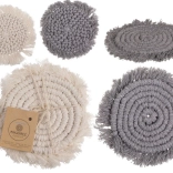 Odkrijte čar makrame podstavkov v modernem sivem odtenku. Okrogla oblika, čvrsto sukano vlakno in okrasne resice ustvarjajo brezčasen dodatek, ki se odlično poda na jedilno mizo, klubsko mizico ali delovni kotiček. Podstavki zanesljivo zaščitijo les in občutljive površine pred toploto skodelice, madeži in praskami.