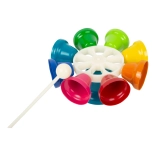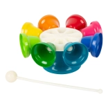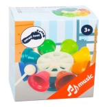 Druga barva, drug zvok! Otroški glasbeni vrtiljak je sestavljen iz osmih barvnih zvončkov, uglašenih na tone C–D–E–F–G–A–H–C. Z priloženo paličico nanj igrate podobno kot na ksilofon, priložen je tudi komplet barvno označenih not za začetnike. Pri otrocih spodbuja ritem, glasbeni posluh in koordinacijo roka–oko.