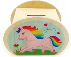 Ta barvita hranilnica s samorogom spodbuja otroke k finančni pismenosti in učenju vrednosti denarja. Robustna izdelava iz naravnega lesa zagotavlja dolgo življenjsko dobo in prijeten naraven videz, ki se lepo poda v otroško sobo.
