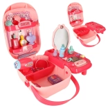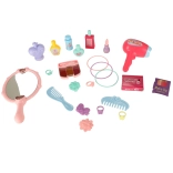 V kompletu so glavnički, ogledalce, stekleničke, dodatki za lase in drugi rekviziti za realistično igro frizerstva in kozmetike.