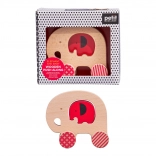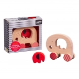 Odstranljiv rdeč mladiček se vstavi v odprtino na sredini slona. Otroci urijo prijem, logiko in koordinacijo pri vlečenju na kolescih.