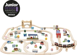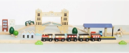 Ta velika lesena železniška proga popelje otroke v srce mesta, navdihnjenega z Londonom. Z bogato opremo – od postaje in pisanih stavb do ikoničnega dvižnega mostu – ponuja nešteto igralnih scenarijev ter spodbuja odprto, domišljijsko igro. Dva vlaka z magnetnimi vagoni se zlahka spajata in varno vozita po stabilnih lesenih tirih.