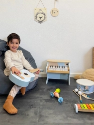 Začnite domače koncerte s tem stilskim otroškim bobnom! Zahvaljujoč nastavljivemu bombažnemu pasu, tihim palčkam z zvočno dušilnimi nastavki in čvrsti leseni konstrukciji je idealen za prve korake v svet glasbe. Spodbuja ritem, koordinacijo roka–oko ter fino motoriko, hkrati pa v otroški sobi izgleda odlično.