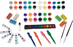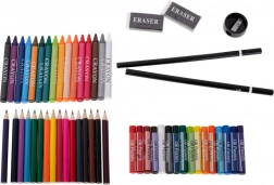Zbirka vključuje različna orodja kot so barvice, markerji, oljne pastele, barve in čopiči, kar spodbuja kreativno izražanje.