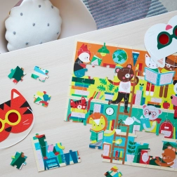 S pomočjo dveh živalskih 3D očal odkrijte skrite predmete v živahni sceni knjižnice s to zabavno sestavljanko od Petit Collage.