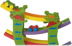 Ta lesena dirkalna steza s krokodili spremeni otroško sobo v mali dirkalni krog. Otroci postavijo avtomobilček na start in opazujejo, kako živahno drsi po posameznih nivojih vse do cilja. Pestre barve in vesel motiv krokodilov vabijo k igri znova in znova.