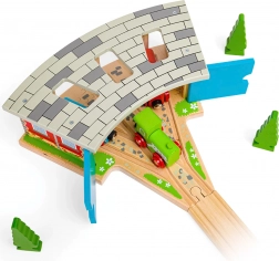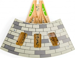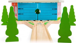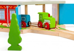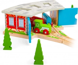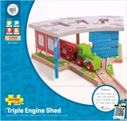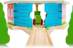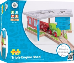Trojna lokomotivna lopa z vrati je idealen dodatek za vsakega malega strojevodjo. Zahvaljujoč trem stojem in vgrajeni povezavi tirov boste zlahka organizirali promet na progi in pospravili vlakce po dnevu polnem vožnje. Trdna lesena konstrukcija z barvnimi podrobnostmi deluje realistično in prenese tudi intenzivno igro.