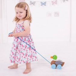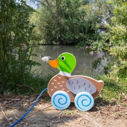 Ta klasična vlečna račkica vabi otroke k aktivni igri in prvim sprehodom. Zahvaljujoč stabilnim kolescem in gladkemu teku jo je enostavno voditi z vrvico, med vožnjo pa krila veselo migljajo. Kombinacija privlačnih barv in prijetne lesene izdelave naravno podpira radovednost in samostojno gibanje.