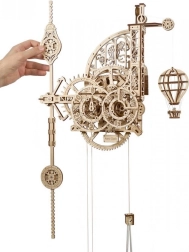 Ugears Aero so stenske mehanske ure iz kakovostne vezane plošče, ki jih sestavite sami brez lepila. Očarljiv pogled na odkrit urni mehanizem z nihalom in utežjo ponuja edinstveno izkušnjo natančnega inženirstva. Čas odčitavate z dvojnih številčnic, ki se vrtita v nasprotni smeri urinega kazalca, medtem ko dekorativni model toplozračnega balona redno naraste in se vsako polno uro znižanjem oglasi.