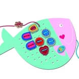 Barvita ribica, ki podpira otroško kreativnost in pravilno držanje vezalk pri šivanju.