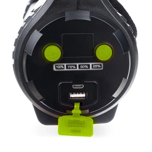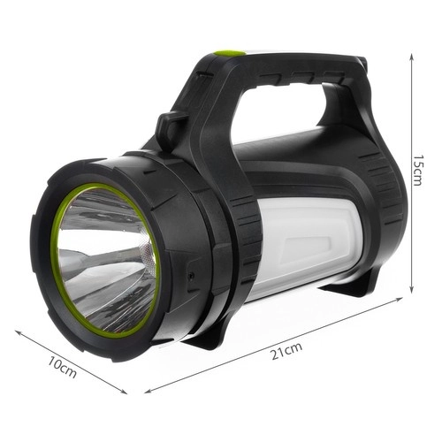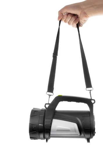 Zmogljiv ročni LED reflektor z zgornjim ročajem ponuja svetilnost do 1200 lm, doseg približno 500 m in avtonomijo 6–8 ur. Trpežna vodoodporna in prašno tesna zasnova, stranska rdeča opozorilna luč (neprekinjena in utripanje) ter vgrajena powerbanka 8000 mAh z USB izhodom ga naredijo idealno izbiro za kampiranje, ribolov, v avtu in za nujne primere. V paketu sta nastavljiv naramnica in polnilni kabel.