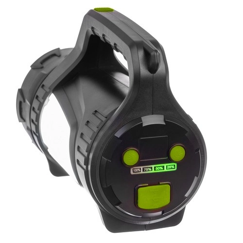 Ta robustni ročni LED reflektor je zasnovan za zanesljivo osvetlitev na terenu in doma. Ponuja do 1200 lumnov z osredinjenim snopom za dolg doseg približno 500 metrov ter pregledne LED indikatorje stanja baterije na zadnji plošči. Trpežna zasnova je vodoodporna in prašno tesna, ojačano ohišje bolje prenaša udarce in grobejše ravnanje.