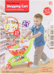Odličen plastični nakupovalni voziček na kolesih za majhne prodajalce. Priloženih je 25 živil in zabava za otroke od 3 let naprej.