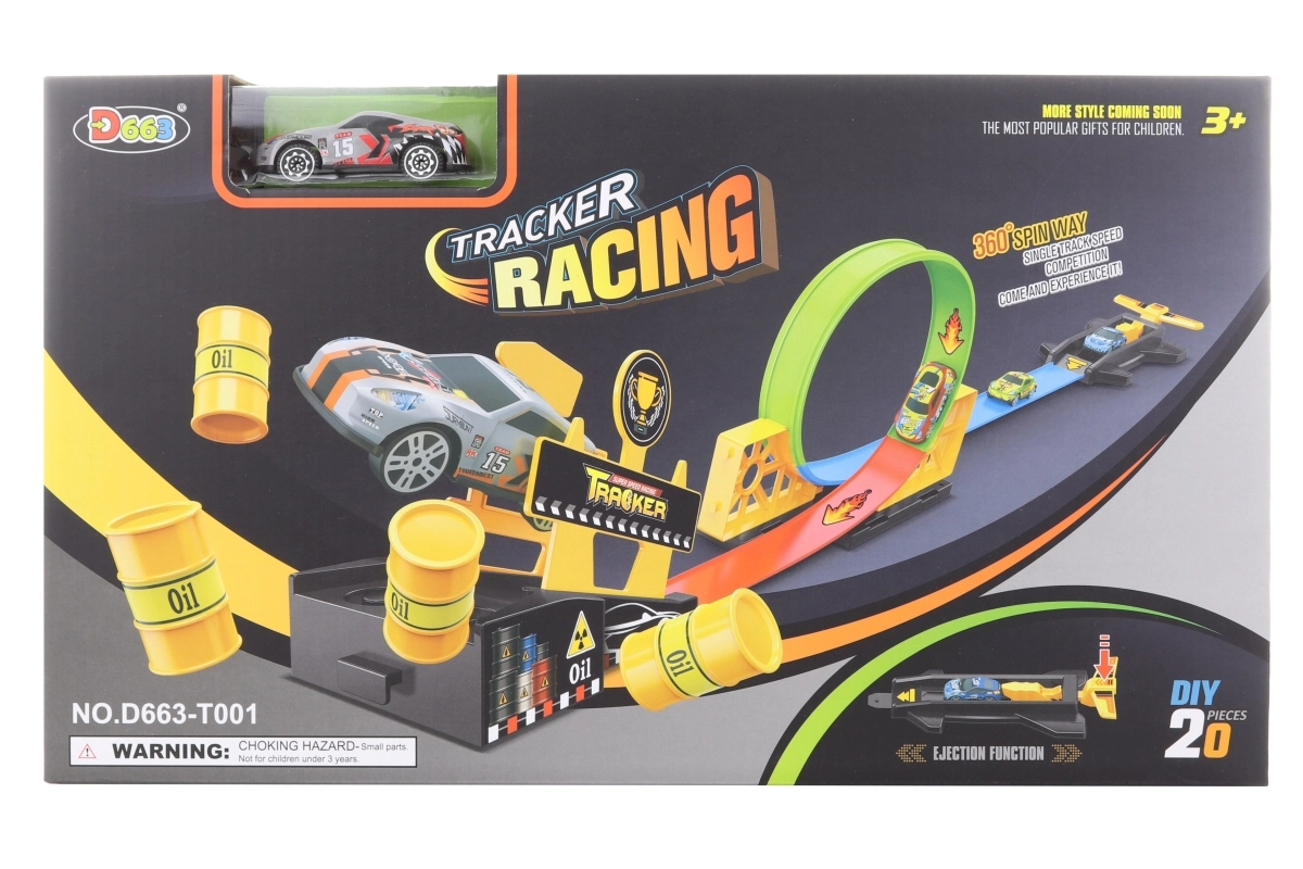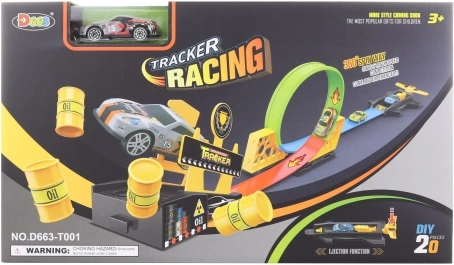 Izstrelitvena steza s kovinskim avtomobilčkom. Dolžina steze približno 125 cm. Dimenzije pakiranja približno 38 × 22 × 6 cm. Starost 3+