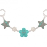 Kaveljčki na obeh koncih omogočajo hitro pripenjanje na voziček, avtosedež ali posteljico. Igrača drži stabilno in dojenčku ne ovira.