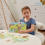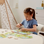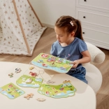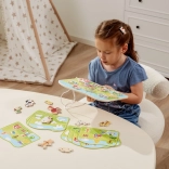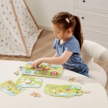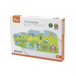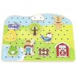 Ta prepletalni set s tematiko kmetije je idealen pripomoček za razvoj spretnosti predšolskih otrok. Otroci po predlogah ali po lastni domišljiji prepletajo vrvice skozi barvite lesene koščke, s čimer krepijo prste, izboljšujejo prijem ter se pripravljajo na pisanje in risanje.