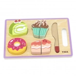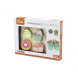 Odkrijte ustvarjalno igro z lesenim kompletom VIGA My Cutting Dessert. Štiri barvite sladice lahko zahvaljujoč spojem z ježkom varno “režete” z lesenim nožem na 8 delov in jih ponovno sestavljate. Pladenj lahko preprosto obrnete in uporabljate kot desko, kar podpira avtentično igro v otroški kuhinjici.