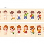 Sekvenčni deli prikazujejo faze oblačenja dečka in deklice, zato si otroci zlahka osvojijo pravilno zaporedje vsakodnevne dejavnosti.