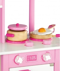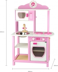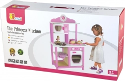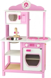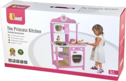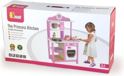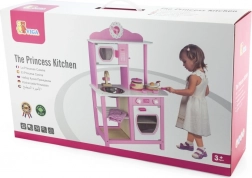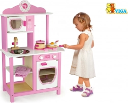 Ta pravljična lesena kuhinjica za princeske VIGA prinaša vse, kar otroci potrebujejo za posnemanje kuhanja. Združuje čudovit dizajn s funkcionalnimi elementi: dvojnim kuhalnikom, pečico z okencem v obliki srca, mikrovalovno pečico in kovinsko korito s pipo. Del paketa je tudi osnovni pripomočki in posoda, da se igra lahko začne takoj po odprtju.