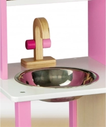 Enostavno odstranljiva posoda korita in lesena armatura učita otroke osnov reda in skrbi za kuhinjico.