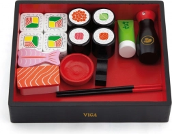 Set vsebuje različne lesene kose sušija, jedilne palčke, posodico za sojino omako in servirni pladenj, ki popolnoma posnemajo avtentično izkušnjo postrežbe sušija. To je odličen način, kako otrokom predstaviti različne vrste jedi in jih naučiti osnovnih veščin japonske kuhinje.