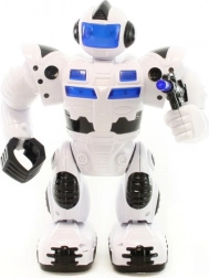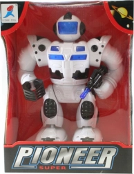 Robot na baterije hodi, sveti in oddaja zvoke, premika roke in glavo. Napajanje z 4x AA baterijami (niso priložene). Velikost robota približno 23 x 17 cm. Starost 3+