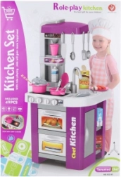 Plastična kuhinja z bogato opremo. Vsebuje popolno kuhinjo s štedilnikom, pečico in umivalnikom, lonce, posodo, plastično hrano in papirnate živila. Dimenzije kuhinje so 70 x 34 x 34 cm. Dimenzije embalaže približno 48,5 x 70 x 11,5 cm. Starost 3+