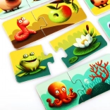 Zabaven set Puzzlika Moj dom uči otroke povezovati živali z njihovimi domovi. Vsebuje 20 velikih trdnih kosov, ki tvorijo 10 parov. Podpira logično razmišljanje, razvoj fine motorike, spoznavanje živali in okolja ter vizualno zaznavanje. Izdelano iz vzdržljivega večplastnega kartona z bleščečo površino, enostavno za čiščenje in idealno za predšolske otroke.