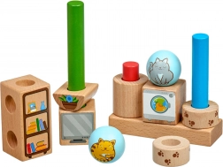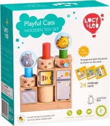 Lesena sestavljanka Igrive mačke prinaša učenje skozi igro z zlaganjem barvitih likov na osnovo z zatiči. S 24 karticami z nalogami otroci preizkušajo različne razporeditve ter se učijo zaznavati prostor, oblike in barve. Kakovostna lesena izdelava in varne barve zagotavljajo dolgo življenjsko dobo in prijetno igro.