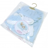 Komplet vsebuje zgornji del, klobuček, nogavice in odejico, ki skupaj tvorijo popoln videz vaše lutke.